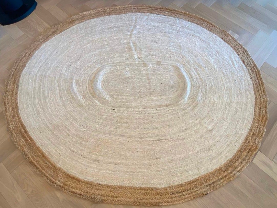Here is the Marketplace photo of a jute rug I frantically bought a couple years ago. You can tell here that it doesn’t lay flat, is ugly, AND is too small for my living room. None of this stopped me from having the seller put it in an uber for me right this second. The moment I opened the trunk and saw it, I knew that I had made a mistake.